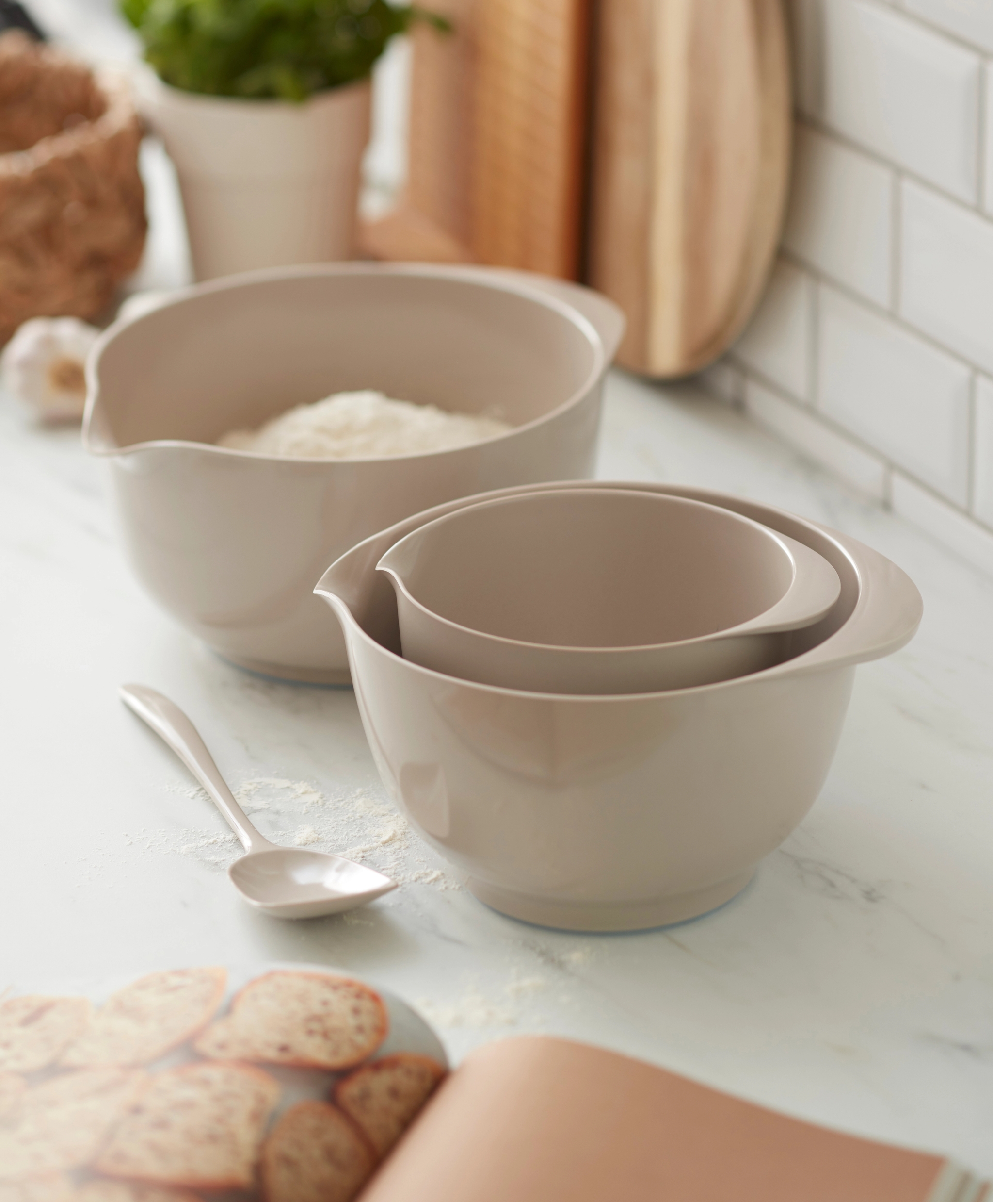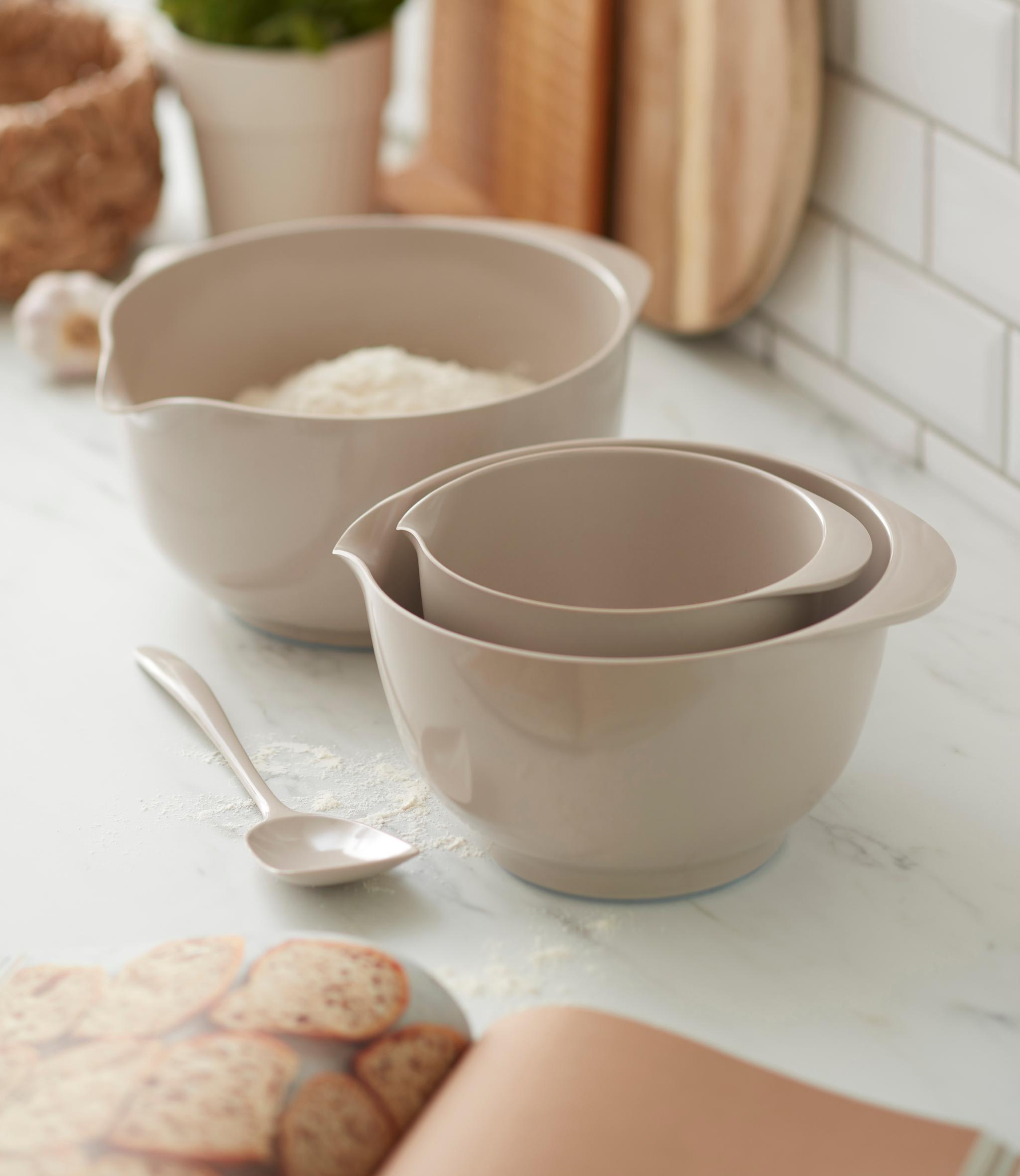 Ett ytterst nödvändigt redskap att ha för bakningen är en skål eller bunke som rymmer en deg som också får plats att jäsa i. Att ha två skålar, en stor och en lite mindre, är därför en bra start. Den stora för degar som behöver jäsa och den mindre för exempelvis deg till småkakor. Vi rekommenderar att satsa på en skål med rund, slät botten och höga kanter – här hittar du skålar och bunkar i alla tänkbara material och storlekar.