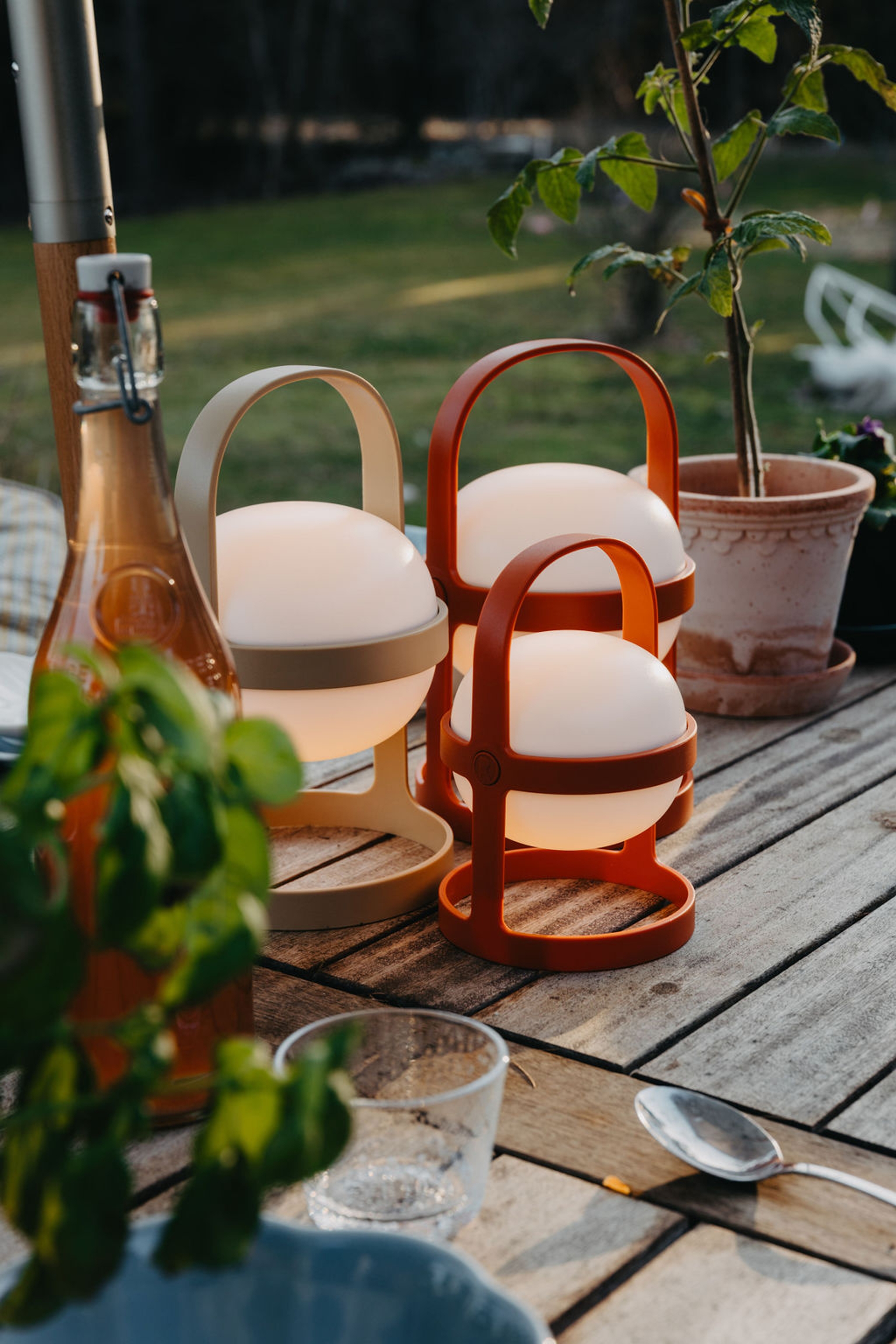 Samla köksredskap och färska örter i vackra krukor, förvara bestick, glas och tallrikar stå i lådor eller backar och sätt upp lyktor och en ljusslinga över uteköket för att sätta stämningen. En filt kan även vara skönt att ha tillhands innan värmen stiger, liksom kuddar och dynor att sitta på.