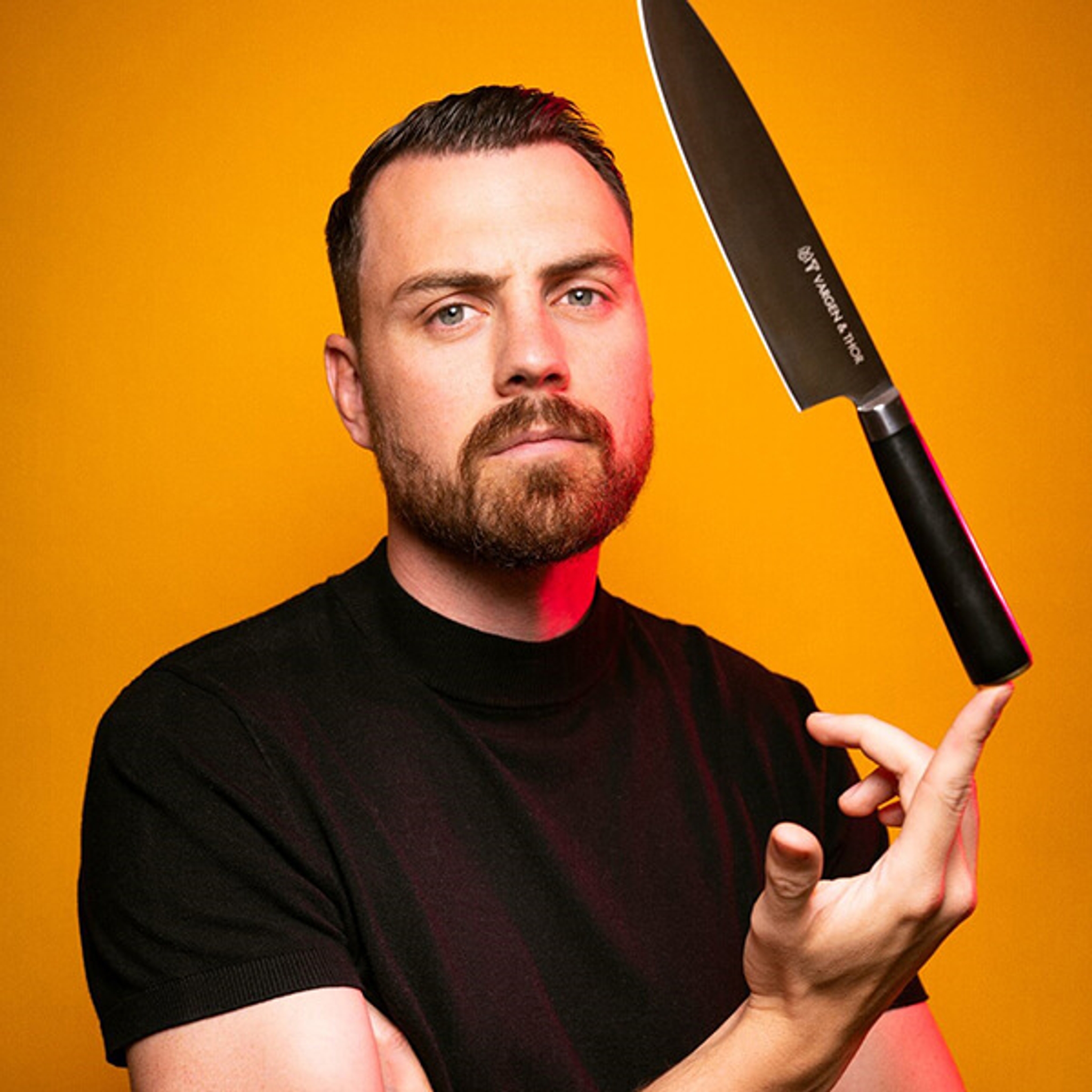 - Namnet kommer från min morfar Roy Thor, som även vår kockkniv är döpt efter. Morfar har alltid varit stor inspiration för mig i mycket och han hade en tam räv när han var yngre. Duon var i trakterna kända som ”Räven & Thor” för att de alltid var tillsammans. Så under första åren hette varumärket faktiskt ”Räven & Thor”. Men jag kände att det var dålig klang i det, samtidigt som min bror gifte om sig till Varghult. Denna bror har även hjälpt mig mycket i processen med design och så vidare. Han har även gjort logotypen. Så det blev Vargen&Thor.