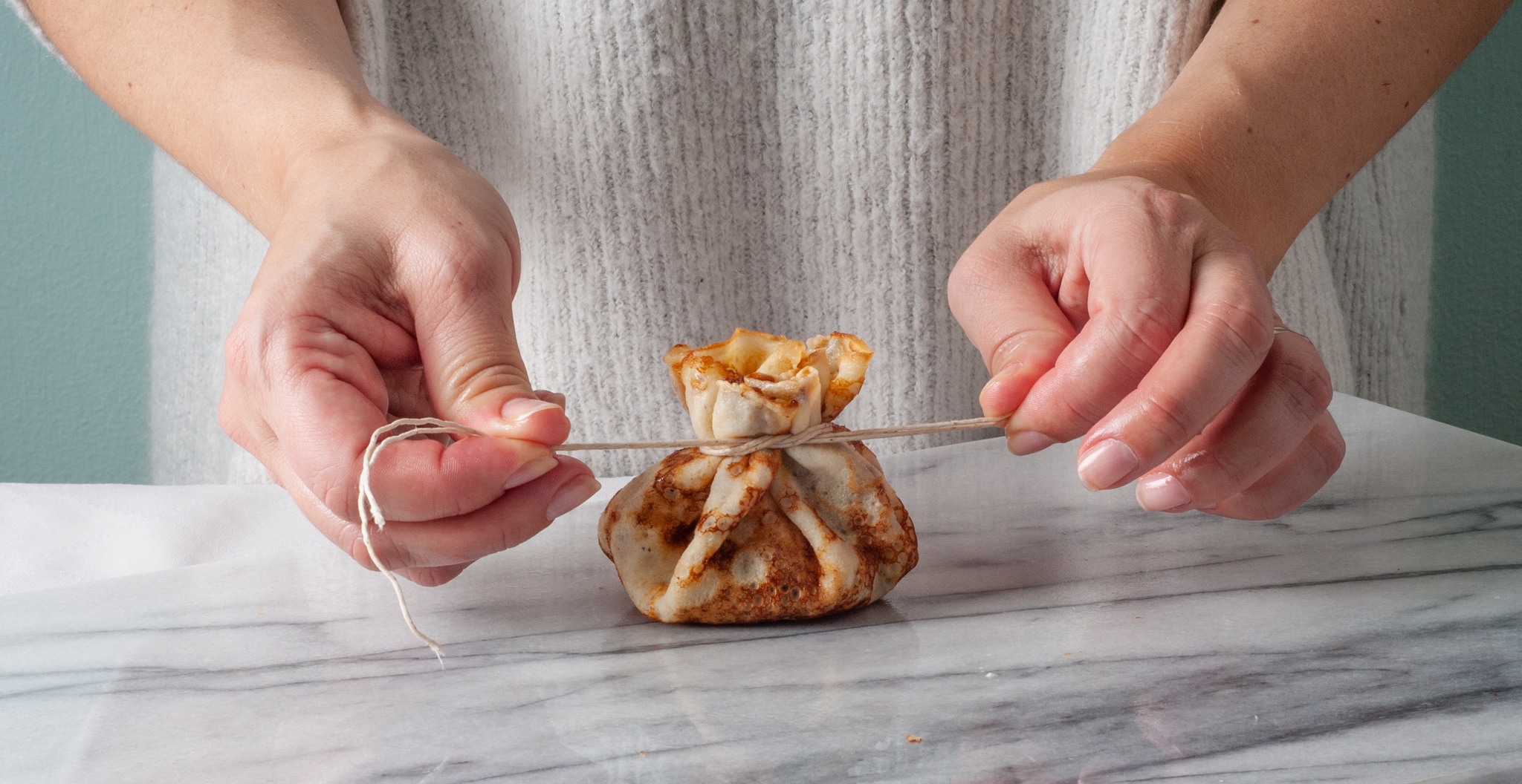 6. Lägg mandelmassa och grädde i mitten av pannkakan. Samla ihop kanterna och knyt försiktigt ihop pannkakan till ett knyte. Pudra med florsocker.
