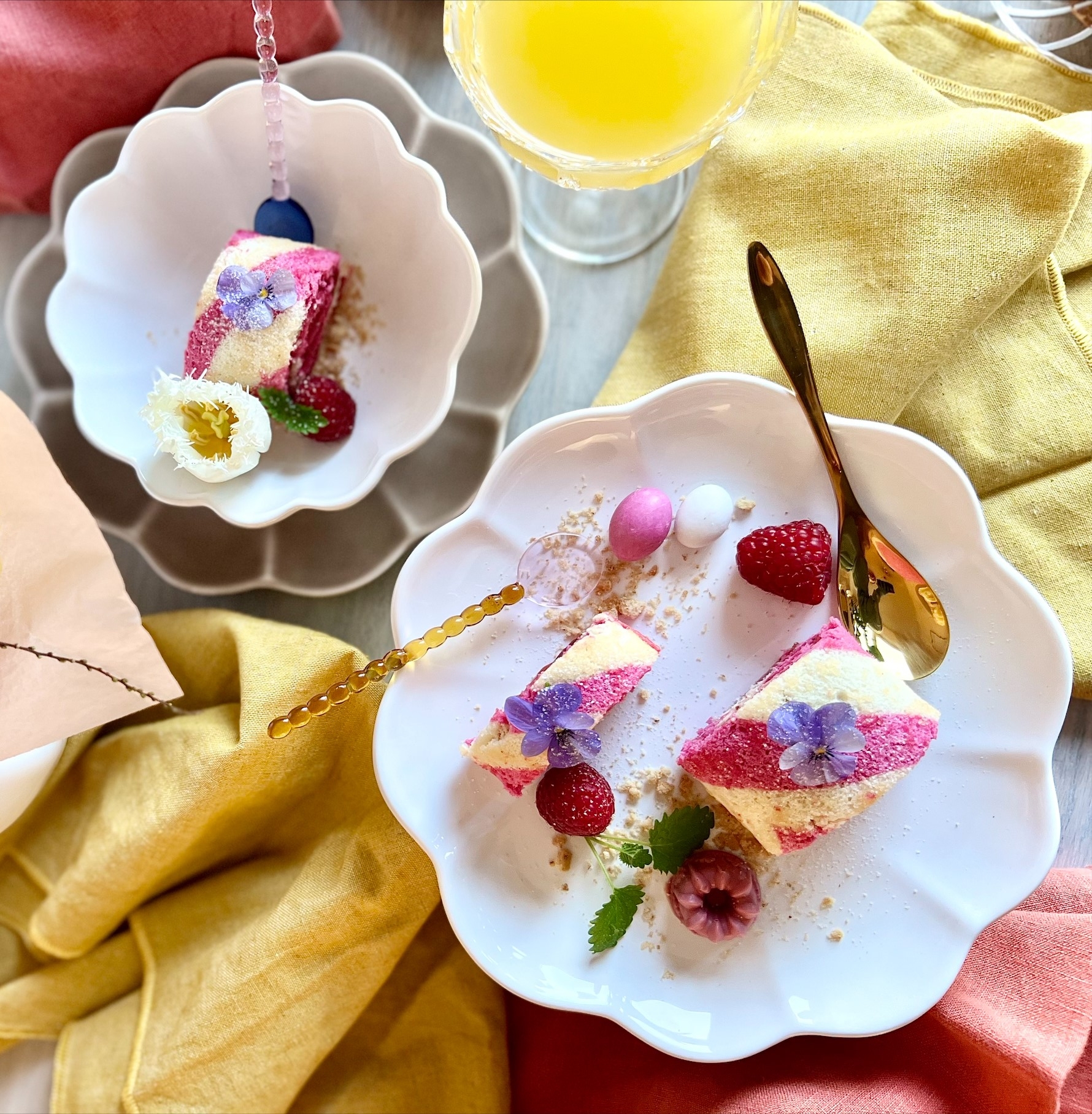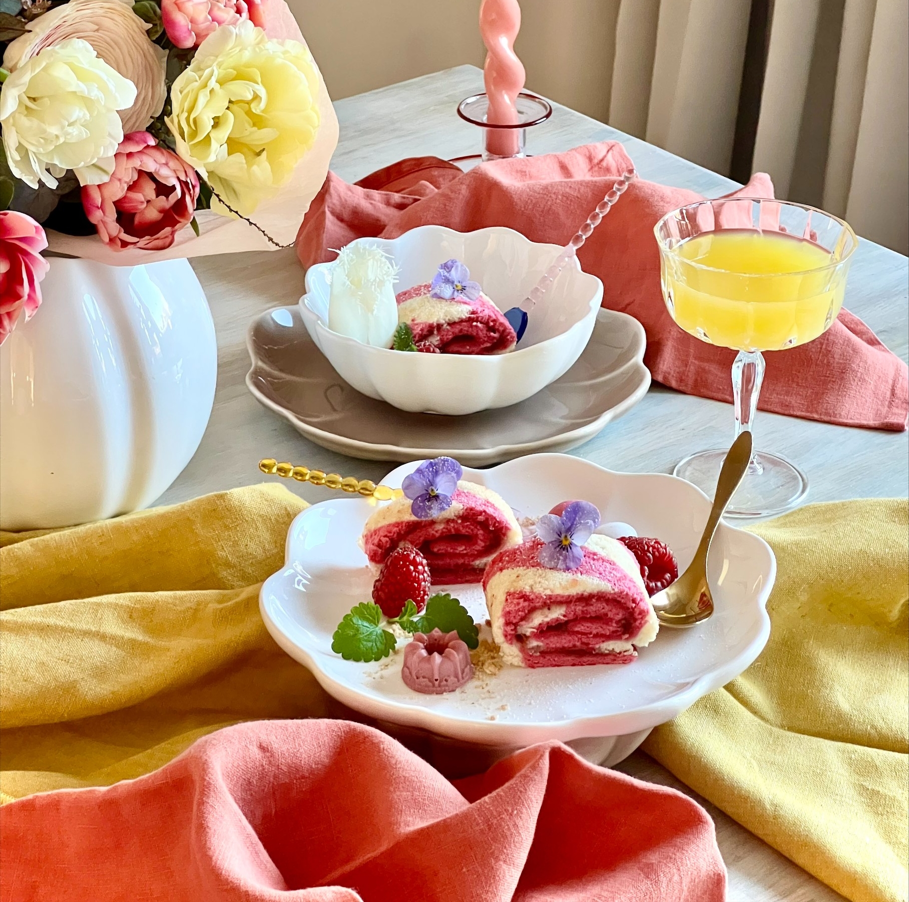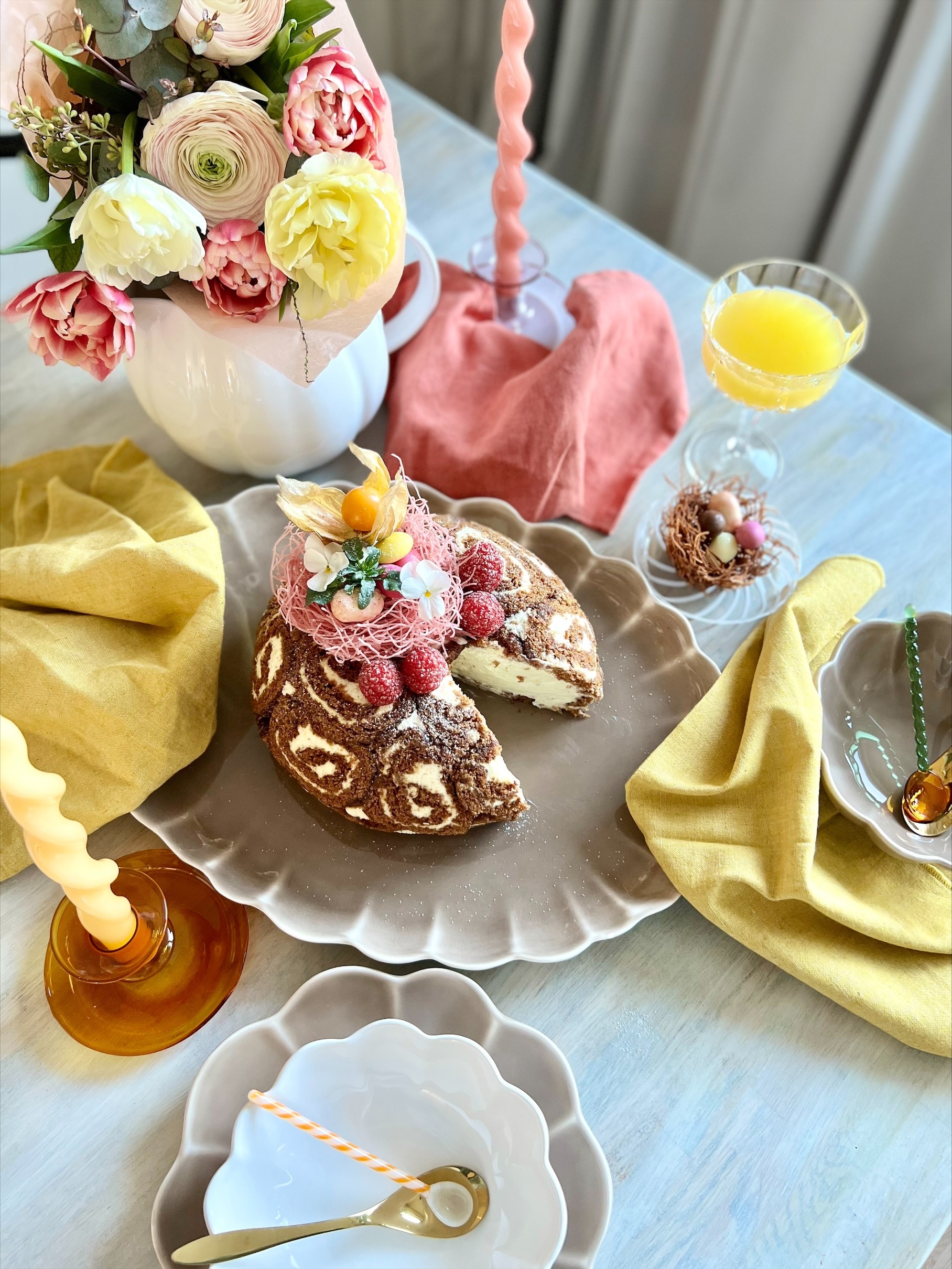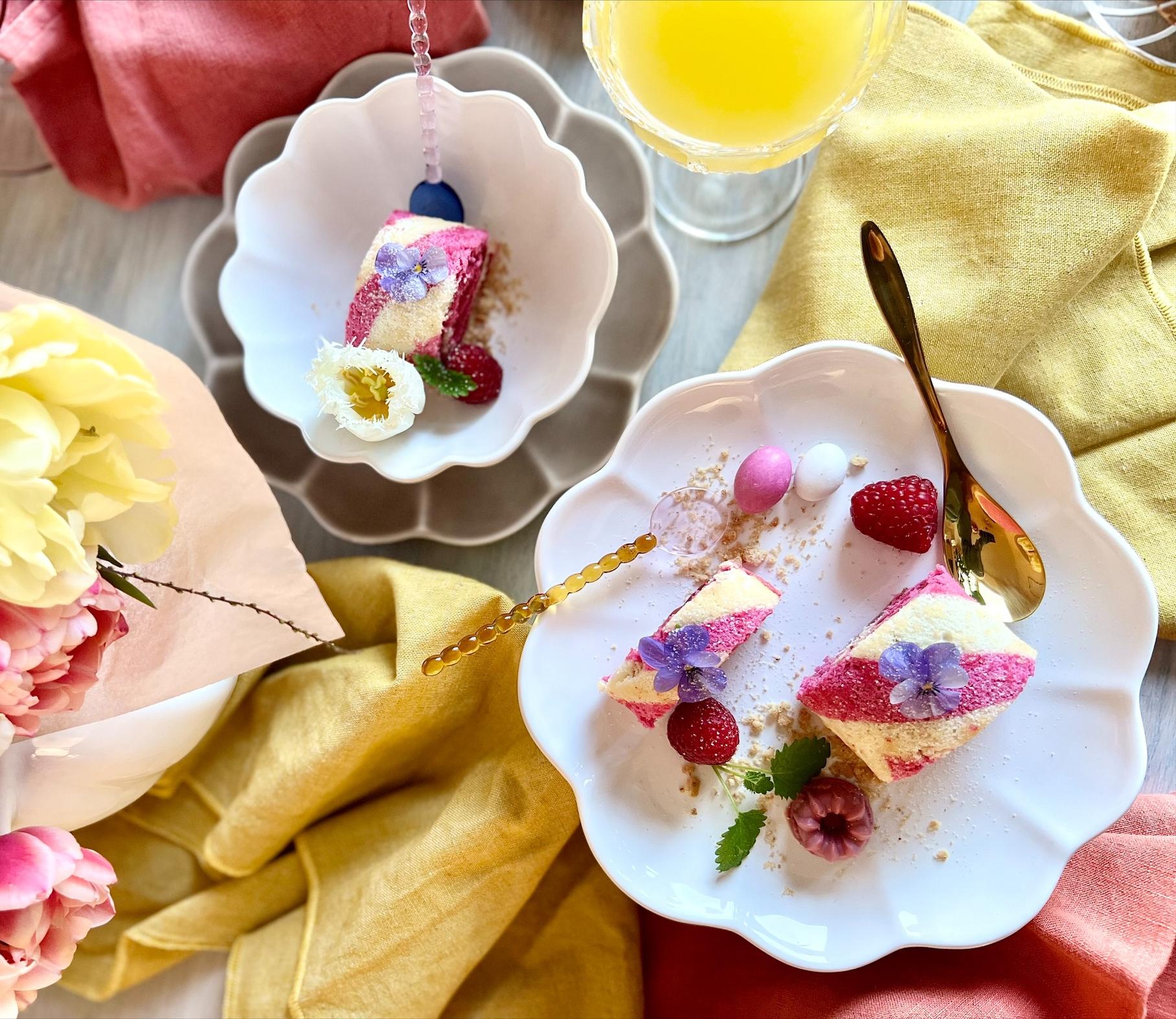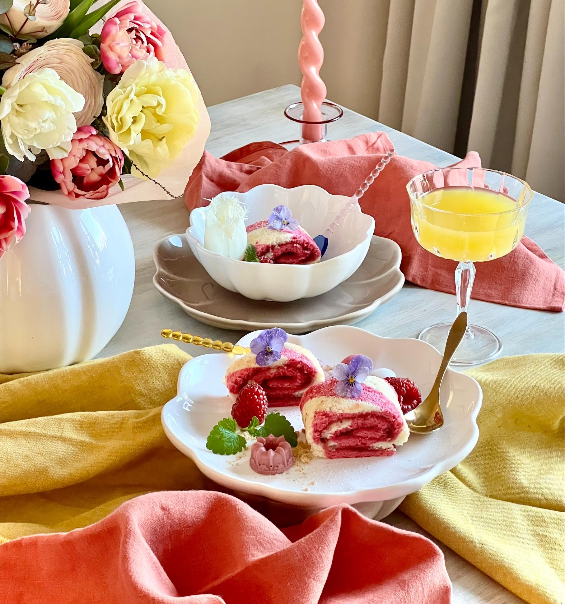 "Påsken dominerar ofta i gult men vad sägs om att överraska fikagästerna vid påsk med en rosarandig rulltårta? En rolig trend och variant av den klassiska rulltårtan och samtidigt en snabblagad fika. Addera lite färska bär och påskgodis, så har du säkrat upp en härlig fikastund i påsk!"