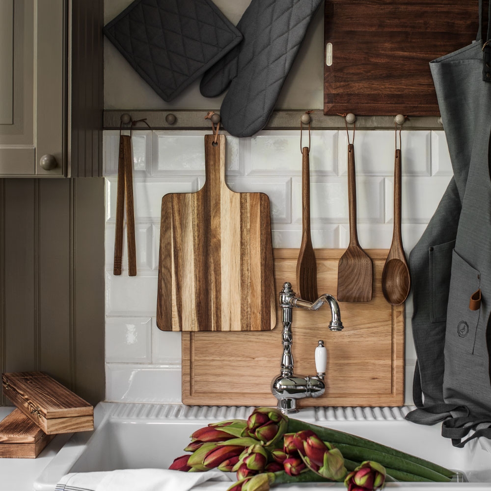 - Efter varje användning bör du rengöra skärbrädan noggrant med varmt vatten och mild diskmedel. Skölj av och torka väl. Undvik att blötlägga skärbrädan i vatten eller att tvätta den i diskmaskin. Fukten som tränger in, vattnets höga temperatur och diskmedlet sliter på ytskiktet och den efterföljande torkningen kommer att leda till att träet spricker.