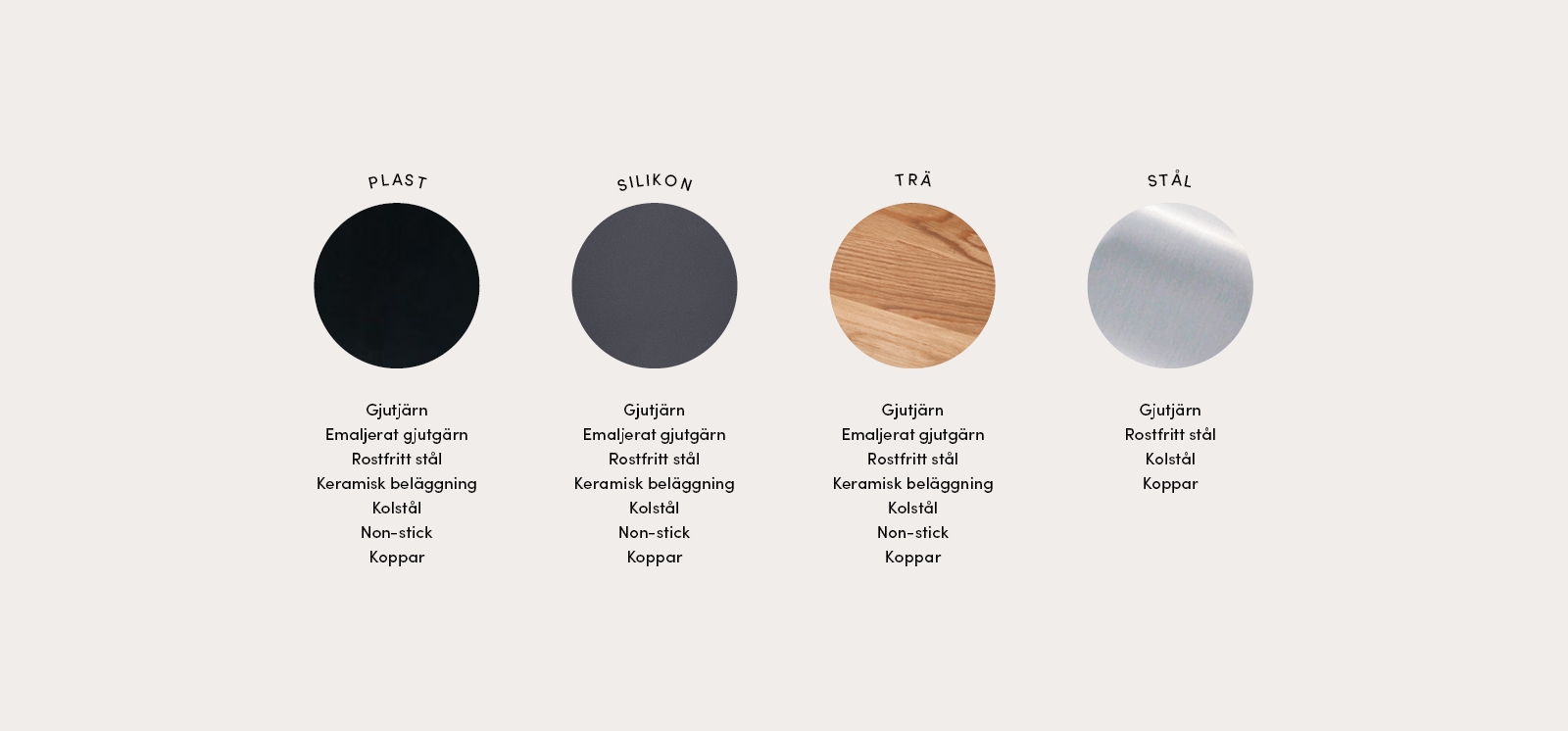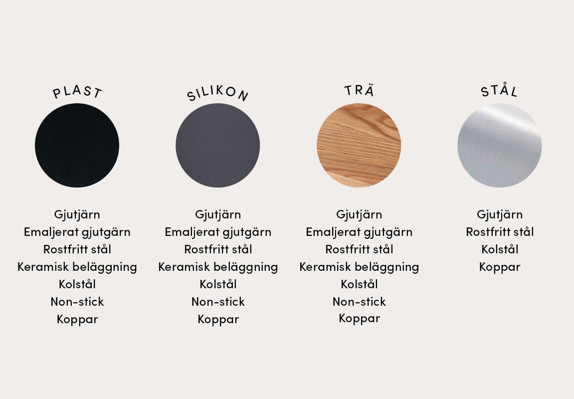 Det är viktigt att stekspadens material passar din stekpanna så att den inte förstör beläggningen/ytan på pannan. Nedan ser du vilket material som passar vilken panna.