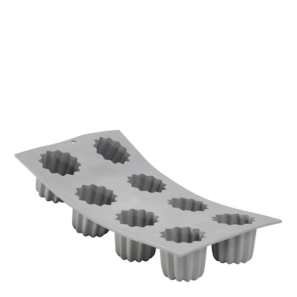 Bakform Elastomoule för 8 Canelé Bordelais från de Buyer. Det klassiksa franska bakverket Canelé har sitt ursprung i Bordeaux och är ett traditionellt franskt bakverk. En canelé har en ljuvlig smak av rom och vanilj med en mjuk och len vaniljsås och en mörk, tjock karamelliserad yta - en riktig delikatess. Canelé har formen av en liten, tvärstrimmig cylinder upp till fem centimeter hög med en fördjupning i toppen. Elastomoule med 8 former prefekt för att göra traditionella mini Canelés.