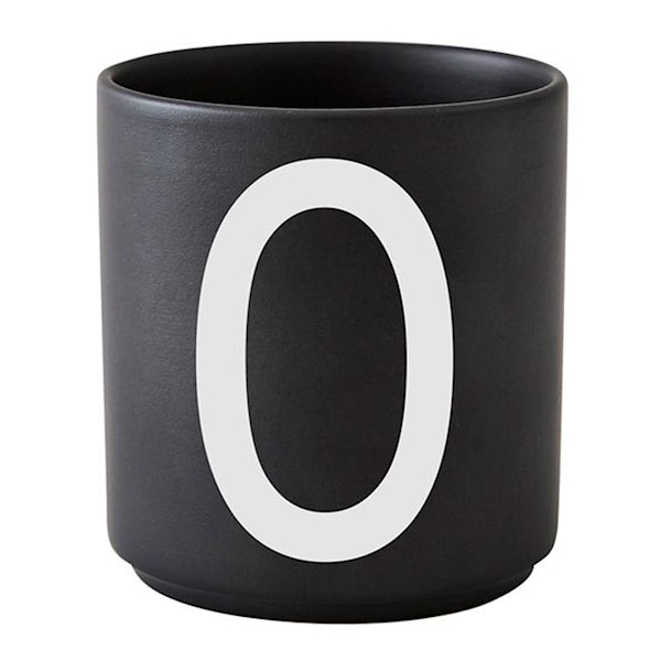 Stilrena svarta muggar tillverkade av glaserat benporslin med vitt tryck. Välj mellan alfabetets alla bokstäver från A till Z.