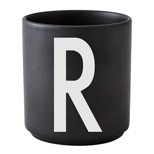 Stilrena svarta muggar tillverkade av glaserat benporslin med vitt tryck. Välj mellan alfabetets alla bokstäver från A till Z.