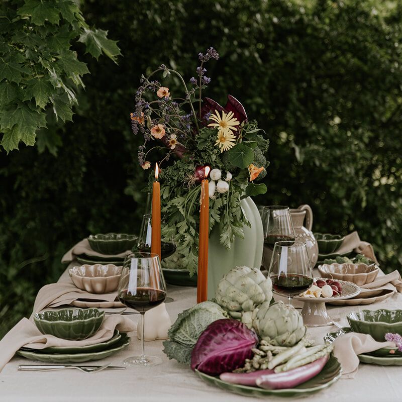 En dukning kan enkelt göras mer formell med dekorativa detaljer från sortimentet, såsom ljusstakar, grytunderlägg, servetthållare, glasunderlägg och uppläggningsfat.